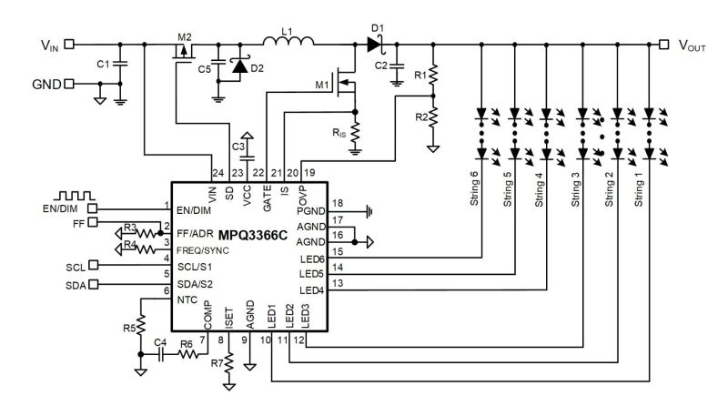 The device uses peak current mode as its pulse-width modulation (PWM) control architecture to regulate the boost converter within the controller. Six channel current sources are applied to the LED cathode to adjust LED brightness. The MPQ3366C-AEC1 regulates the current in each LED string to the value set by an external current-setting resistor, with 2.5% current regulation accuracy between strings.