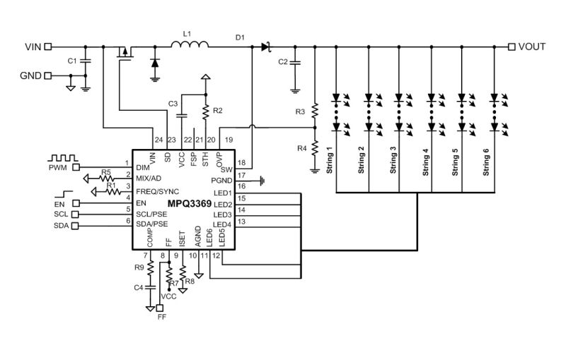 MPQ3369采用峰值电流模式的PWM 控制架构来调节升压变换器。6 路电流源被施加在 LED 阴极接口上以调节 LED 亮度。MPQ3369可以将每个 LED 灯串的电流均调节至外部电流设置电阻设定的电流值,灯串之间的电流匹配精度为 2.5%。