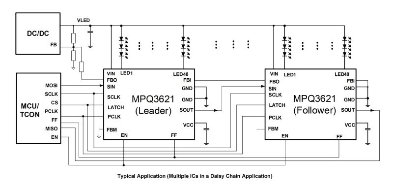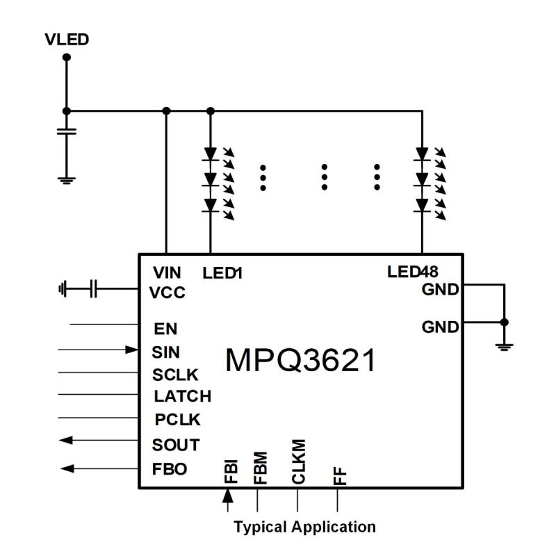 The MPQ3621-AEC1 is a 48-channel LED driver with a 12V voltage rating and maximum 50mA current sources. It is designed to drive LED arrays for local dimming backlighting in automotive LCD panels.