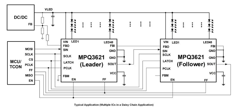 The MPQ3621-AEC1 employs low headroom to regulate the LED current (ILEDx, where x = 1–48). The adaptive voltage feedback function optimizes the LED voltage (VLEDx, where x = 1-48), which achieves higher system efficiency.