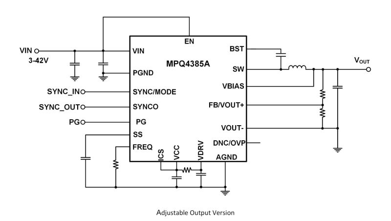 The MPQ4385A-AEC1 is a configurable-frequency (200kHz to 2.5MHz) synchronous step-down switching regulator with integrated internal high-side and low-side MOSFETs (HS-FET and LS-FET, respectively). It provides a highly efficient 20A to 25A output current (IOUT) with fixed frequency Zero-Delay pulse-width modulation (PWM) (ZDPTM) control for optimal transient response. The wide 3.3V to 36V input voltage (VIN) range accommodates a variety of step-down applications in automotive environments. A 1.5μA shutdown mode quiescent current (IQ) allows the device to be used in battery-powered applications.