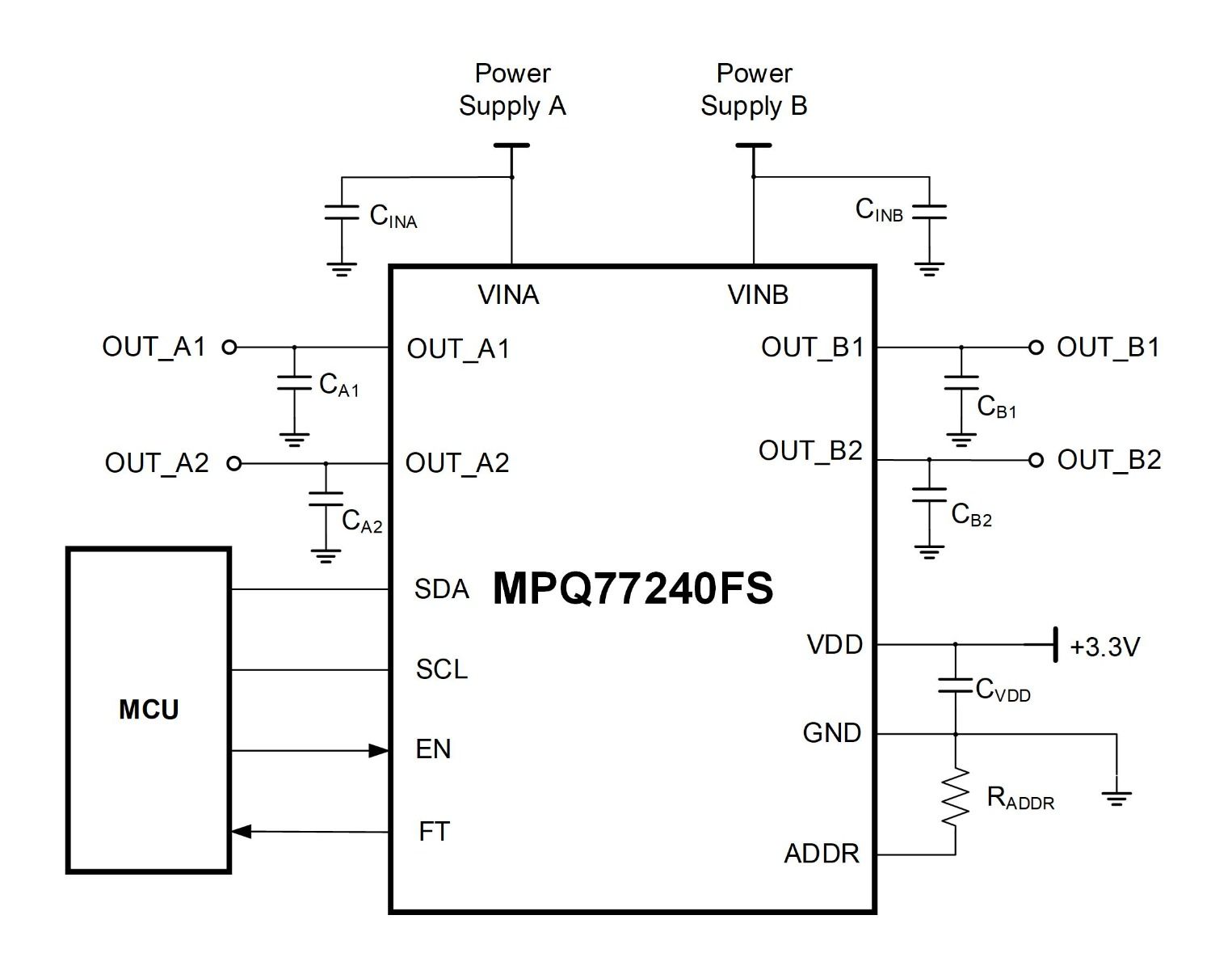 MPQ5894-AEC1 提供双通道可选引脚和一个复用电流采样引脚,用于输出所选通道的负载电流或故障状态。此外,它还可以检测关断状态下是否发生负载开路。一旦发生任何全局或通道故障,即将全局 FT 引脚置低。