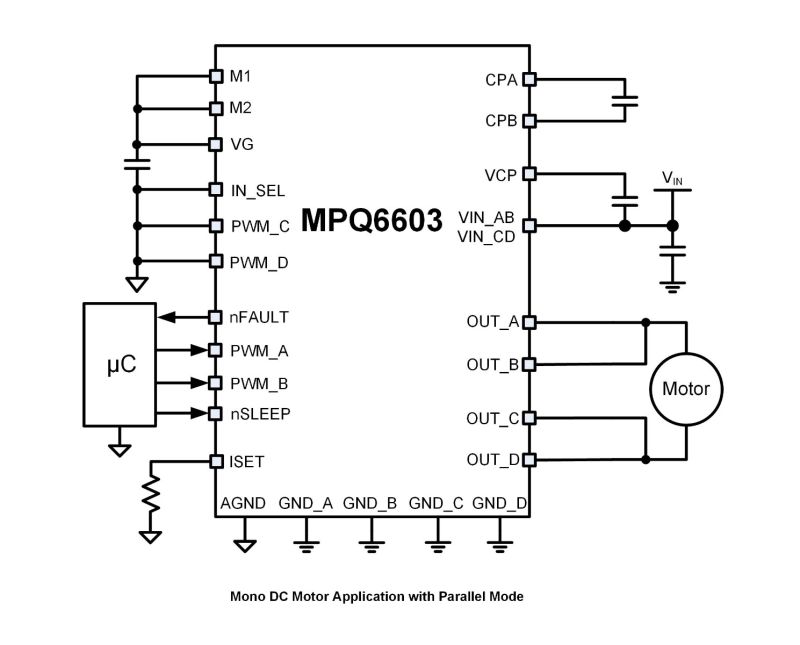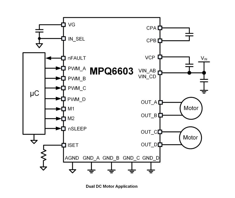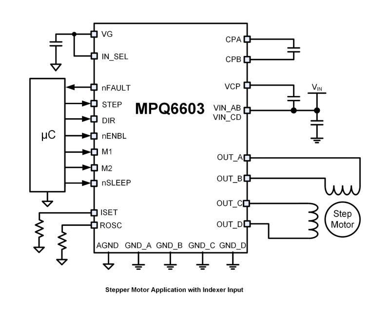 MP6603 为每个半桥提供唯一的独立接地引脚,通过这些引脚还能够实现外部分流电阻进行的电流测量。MP6603 提供两种可配置的输入模式:脉宽调制 (PWM) 输入接口和索引器接口。通过IN_SEL 引脚可配置输入接口。
