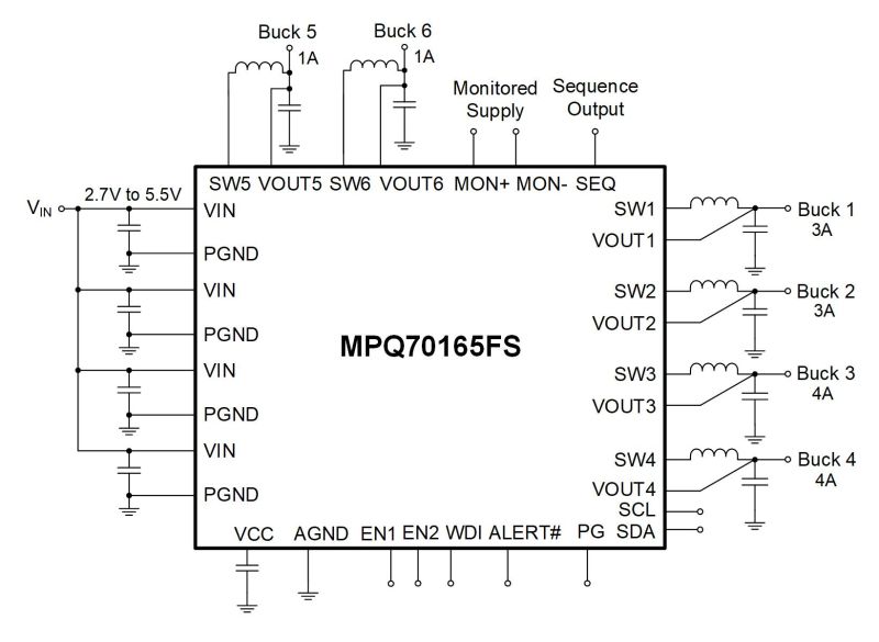 The MPQ70165FS-AEC1 provides a configurable windowed or Q&A watchdog and dedicated WDI pin, external voltage monitor, and sequence output pin (SEQ).