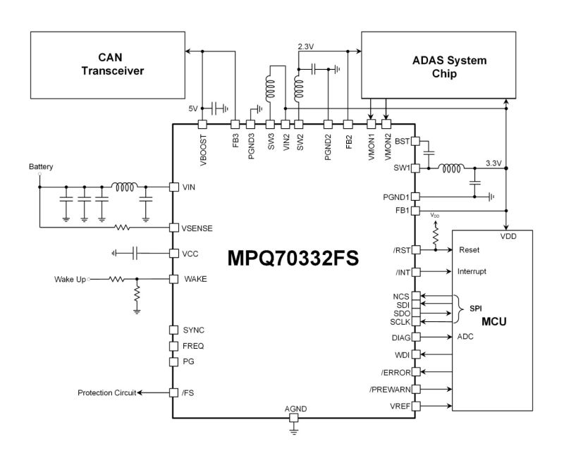 MPQ70331FS-AEC1内置自检 (BIST) 功能用于关键模拟和逻辑功能。其故障安全状态机负责管理故障处理并控制安全输出。此外它还集成了可配置看门狗监控器,并支持窗口模式和问答模式配置。其安全相关模块均具有独立稳压器、带隙和振荡器,因此具备冗余功能以实现故障安全操作。