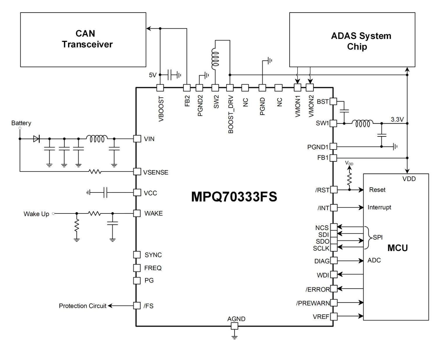 MPQ70700FS-AEC1 是一款功能安全电源管理 IC (PMIC),可为需要多个低压差 (LDO) 稳压器的各种片上系统 (SoC) 或安全微控制器单元 (MCU) 供电。