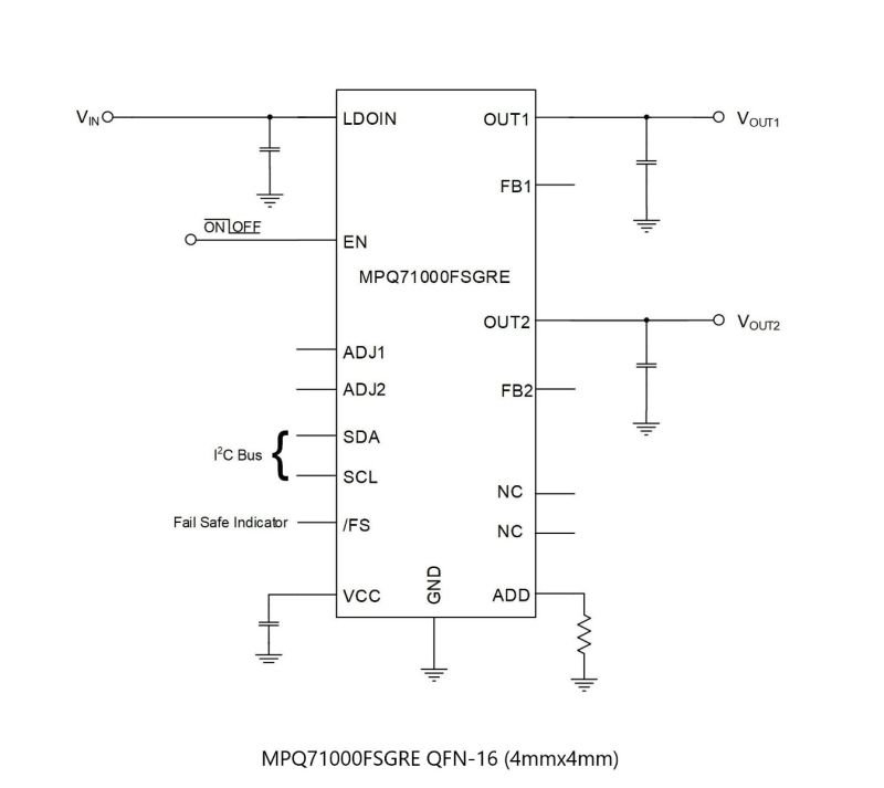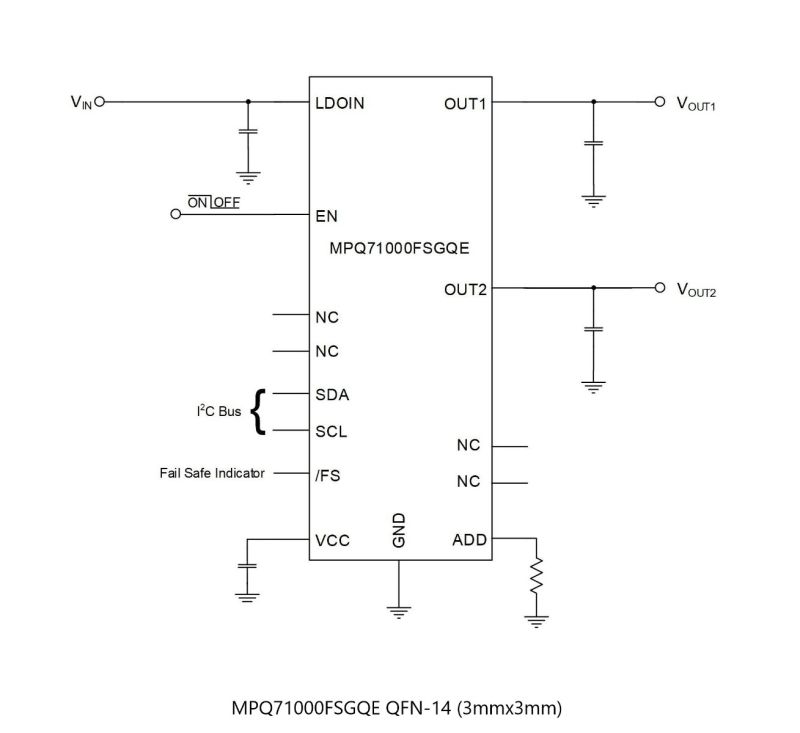 The MPQ71000FS-AEC1 delivers up to 300mA of current per channel with excellent load and line regulation. The dual LDO output voltages (VOUT1 and VOUT2) are both configurable via the I2C interface with a range between 1V and 18V. The standard I2C interface provides flexibility in applications. Various parameters can be adjusted by writing the settings in the device without any hardware changes required.