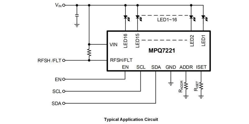 MPQ7221 是一款 16 通道 LED 驱动芯片,宽输入工作电压 (VIN) 范围为 4.5V 至 16V。MPQ7221 为每个LED 串终端应用提供16个内部电流源。每个通道的 LED 电流 (ILED) 都可由外部电流设置电阻来设定,最大电流可达 80mA。
