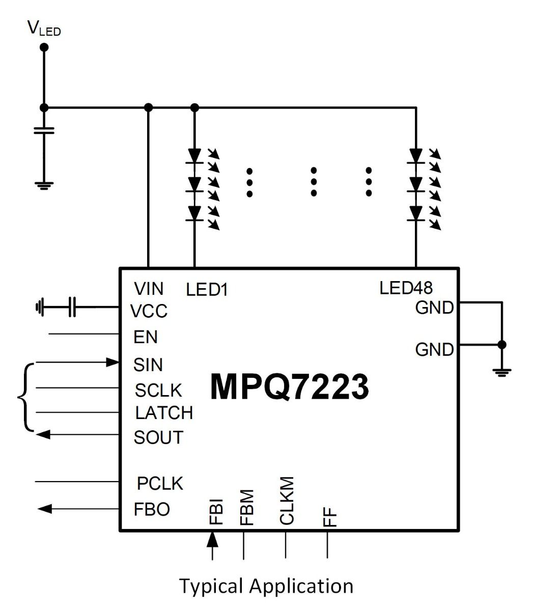 MPQ7223-AEC1产品48 通道、80mA /通道、拉电流驱动器,带串行接口,符合 AEC-Q100认证