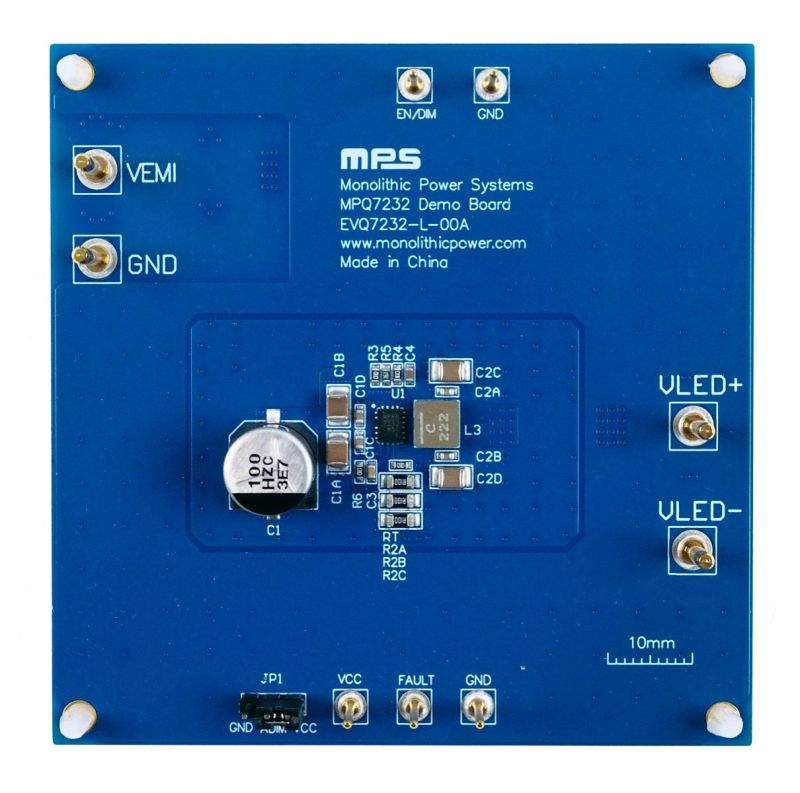 The EVQ7232-L-00A is an evaluation board designed to demonstrate the capabilities of the MPQ7232-AEC1, a synchronous, step-down, constant-current, infrared (IR) LED driver. The MPQ7232-AEC1 is rated for a 4.5V to 36V input voltage (VIN) range. It is a compact solution that can achieve up to 6A of peak LED current (ILED). An ideal configuration is to drive one or two IR LEDs. Peak LED current control mode provides fast transient response and eases loop stabilization.