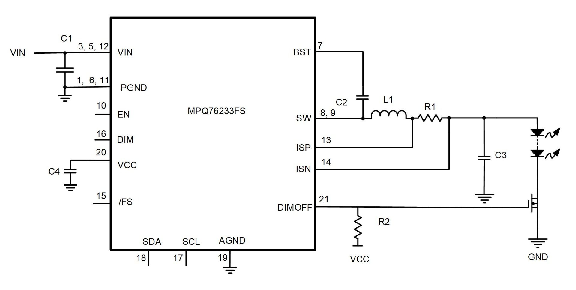 该器件采用同步模式以实现高效率。它还支持小调光占空比下的低脉宽调制 (PWM) 调光频率。MP7235 可支持低至 10Hz 的 PWM 调光频率,以调节 LED 驱动器应用中的红外辐射 (IR)。它兼容 30fps、60fps 和 120fps 调光。