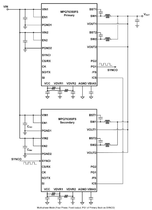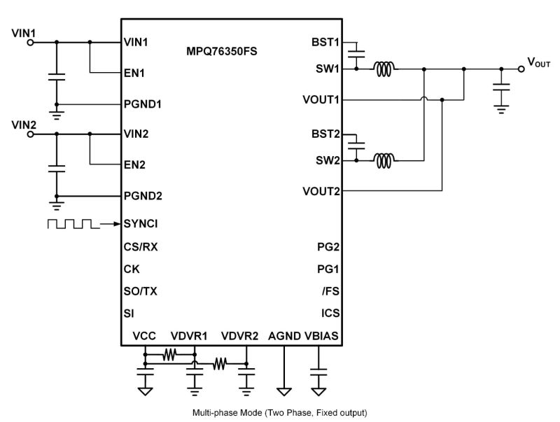 MPQ73350FS-AEC1 提供可选双通道模式或单输出多相模式。在双通道模式下,每个降压变换器都可提供高达 7A的输出电流 (IOUT) ,带散热器时更可高达 12A。该器件支持最多四相的多相并联操作。其开关频率 (fSW) 可在 200kHz 至 2.2MHz 范围内配置,也可通过外部时钟信号同步。此外,该器件还提供频谱扩展 (FSS) 功能以提高 EMI 性能。