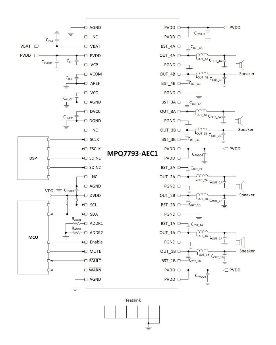 MPQ7793-AEC1产品42V负载突降、75W、4通道、2.2MHz、汽车级数字输入D类音频放大器,符合AEC-Q100认证