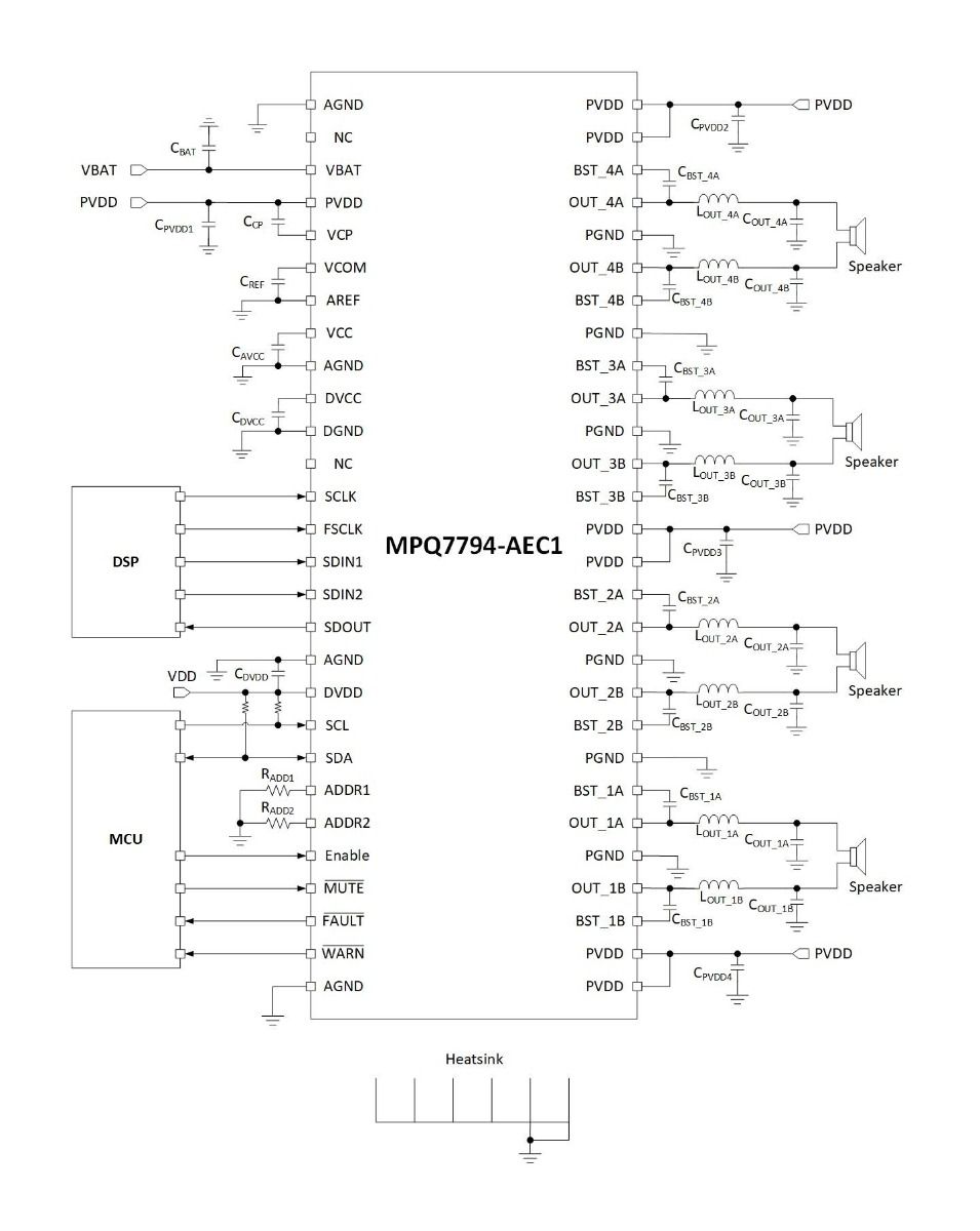 MPQ7794-AEC1产品42V负载突降、75W、4通道、2.2MHz、汽车级数字输入D类音频放大器,符合AEC-Q100认证