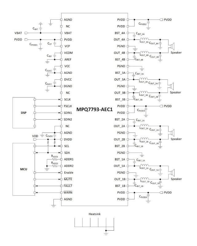Each channel utilizes a bridge-tied load (BTL) structure capable of delivering 25W/60W to speakers with a 14.4V/25V power supply (PVDD) (THD + N = 1%). The MPQ7793-AEC1 also supports parallel BTL (PBTL) output with two channels in parallel, which delivers 50W/120W to speakers at 14.4V/25V (THD + N = 1%).