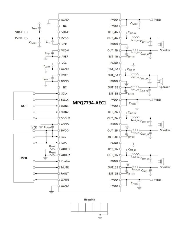 MPQ7793-AEC1 2V Load Dump, 75W, 4-Channel, 2.2MHz, Automotive Digital-Input Class-D Audio Amplifier, AEC-Q100 Qualified