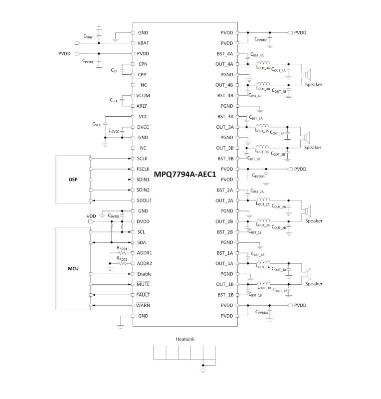 MPQ7794-AEC1 是一款具有低EMI噪声的汽车级4 通道数字输入 D 类音频放大器,带I2C 诊断功能。