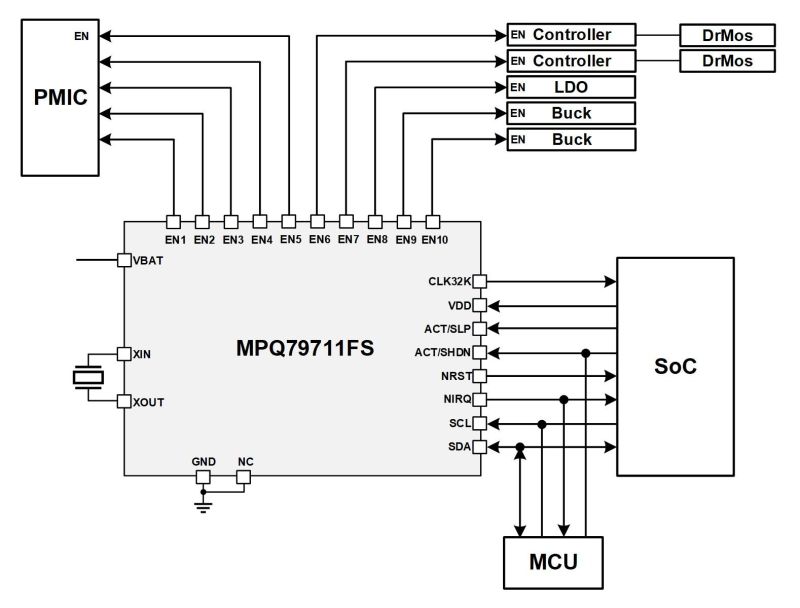 MPQ79700FS-AEC1 包含一个晶体驱动器、一个带闹钟的实时时钟 (RTC)和一个可通过 I2C 接口访问的可配置看门狗监控器(watchdog),同时提供低电平有效系统复位和中断输出功能。