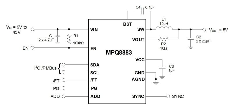 MPQ8883 是高频同步整流降压变换器,具有 I2C 控制接口和多个寄存器一次性可编程功能。。它在宽输入范围内可实现高达 3A 的连续输出电流,具有极好的负载和线性调整率。MPQ8883 集成了内部上下功率 MOSFET 管,无需外部肖特基二极管即可实现高效率,并采用 16 引脚 QFN3x3 封装。MPQ8883 具有内部补偿和反馈分压器,可提供非常紧凑的解决方案,最大限度地减少现有标准外部元器件的使用数量。MPQ8883 采用通用设计,用途广泛。可通过I2C接口实时调节输出电压,调节范围为 0.6V 至 20V。。也可通过I2C接口调节电压斜率、开关频率、使能和节电模式这样,用户可以优化每路输出以满足特定要求。在测试评估期间,可以通过 I2C 接口轻松实现不同的配置,无需返工外部元器件。一旦实现所需的优化设置,就可以使用多个一次性可编程存储器永久存储该设置。电流控制模式提供快速瞬态响应,并使环路更易稳定。全方位保护功能包括欠压锁定保护(UVLO)、过压保护(OVP)、过流保护(OCP)和过温关断保护(OTP)。