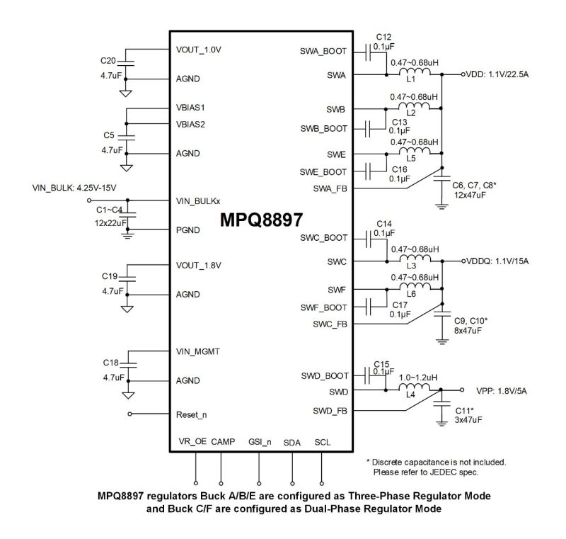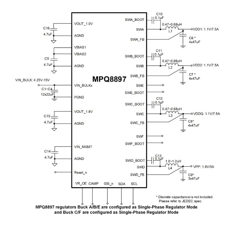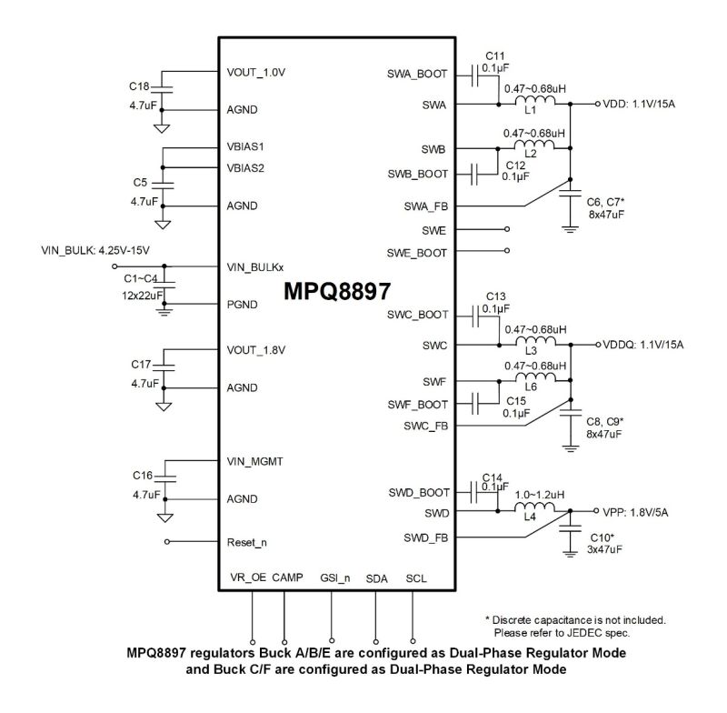 The MPQ8897 provides buck outputs for six channels. Buck A, buck B, and buck E are configured to a three-phase, interleaving buck converter with current-sharing performance. Buck C and buck F are configured to a dual-phase, interleaved buck converter. Buck F serves as a single-phase buck converter that is designed to support the specific power requirement of DDR5 with a high-capacity, second generation, multiplexed rank dual in-line memory module (MRDIMM).