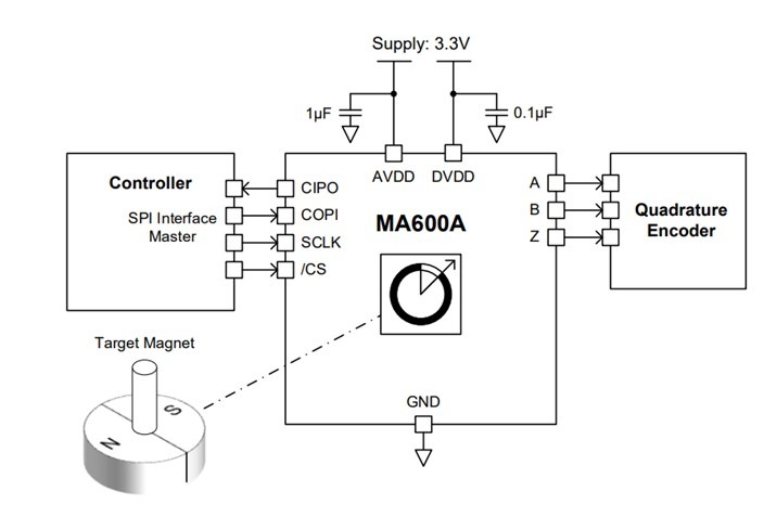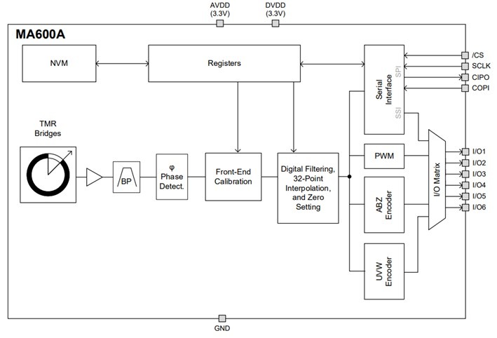 MA600A的工作电压为3V至3.6V,通信接口支持SPI、ABZ、PWM、UVW以及SSI,适用于多种通信协议场合。其支持菊花链配置,配置更加灵活,通过AEC-Q100认证,安全可靠。
