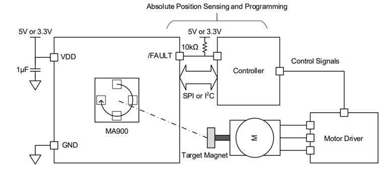 MA900提供两种供电电压,3V至3.6V和4.5V至5V。通信接口支持SPI、I²C、ABZ、PWM、UVW、SSI、SENT,可适配多种电压与通信协议场景。在故障检测方面,MP900还可配置磁场强度检测,便于诊断检查。
