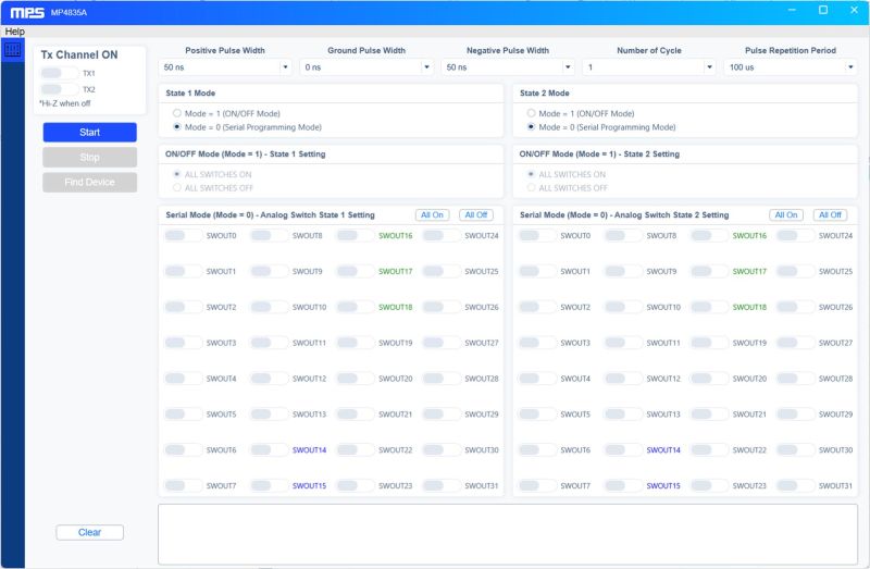 The MPS Ultrasound Test Bench software is a graphical user interface (GUI) that enables configuration and control of MPS analog ultrasound multiplexer evaluation boards via a USB interface. Designed to be intuitive and user-friendly, this GUI works seamlessly with MPS evaluation kits and supports efficient evaluation and testing for the design process.