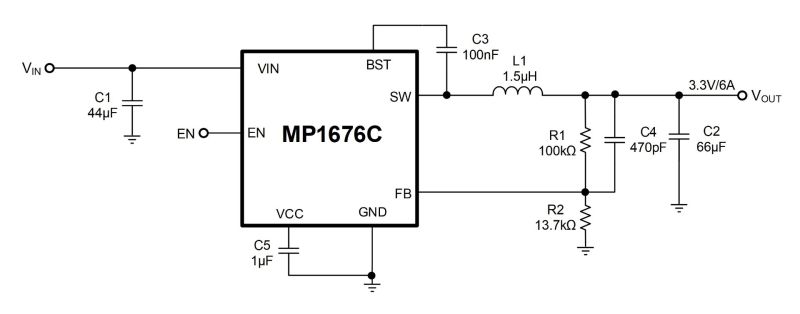 The MP1676C can achieve up to 6A of continuous output current (IOUT) from a 4.2V to 16V input voltage (VIN) range, with excellent load and line regulation. The output voltage (VOUT) can be regulated to as low as 0.4V.