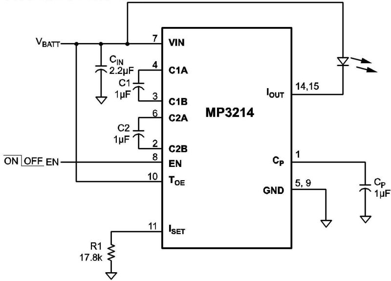 MP3214具有高效率且只需较少的外部元器件(两个小型旁路电容、两个小型电荷泵电容和一个调节电阻),非常适合要求小尺寸和高效率的便携式应用。