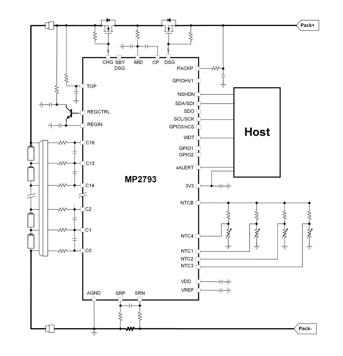 其上管MOSFET (HS-FET) 驱动器和强大的硬件 (HW) 保护功能均具有可调阈值。保护功能包括了过流保护(OCP)、短路保护(SCP)、电池组和单电池过压保护(OVP)、电池组和单电池欠压保护(UVP)、过温保护(OTP)和欠温保护(UTP)。MP279x 还集成了内部平衡 FET 以均衡不匹配的电池,同时可选择控制外部 FET来获得更高水平的平衡电流。