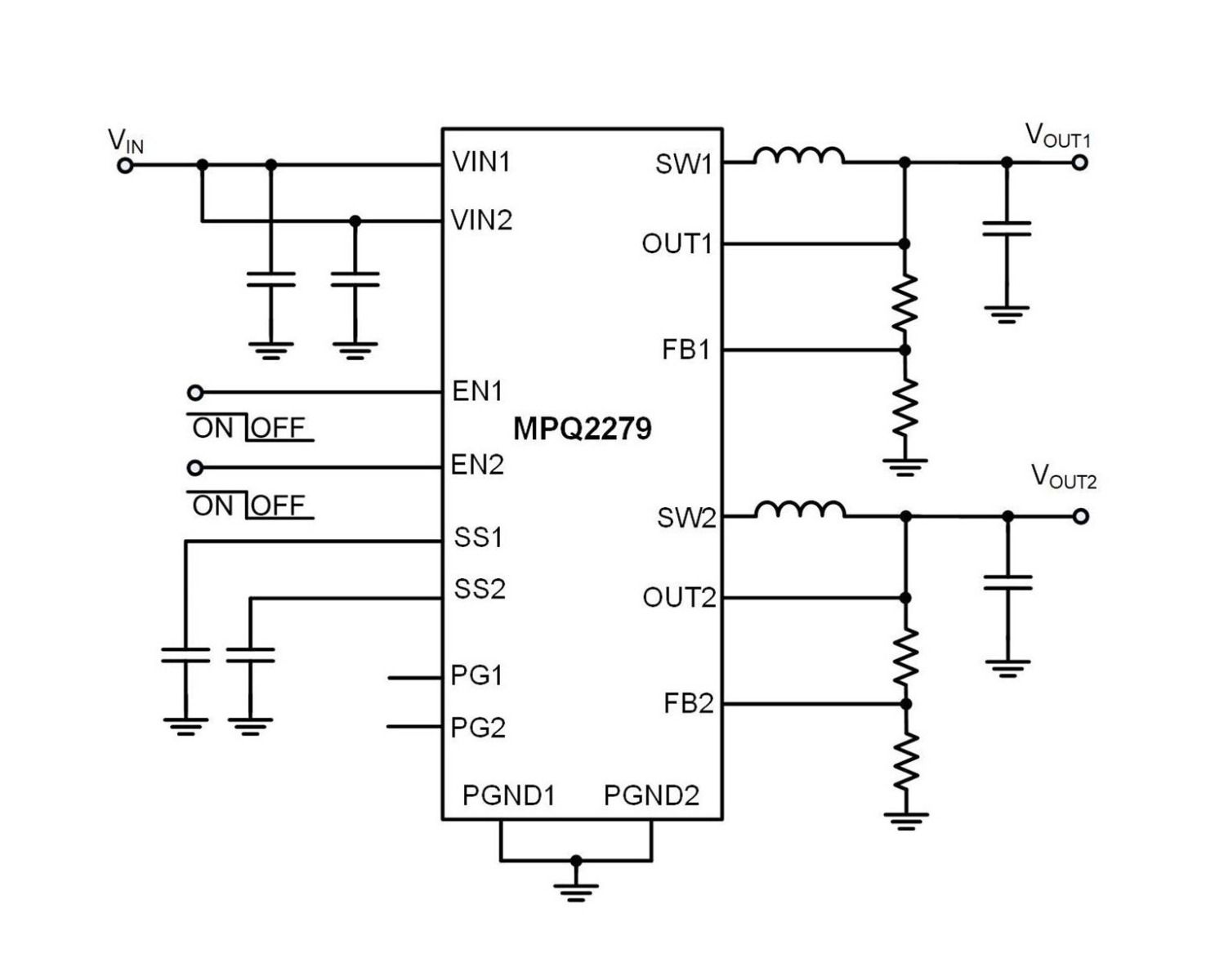 MPQ8875A 可通过 I2C 接口设置配置参数,且无需更改任何附加的硬件。开关频率(fSW)可以在 200kHz 至 1MHz 范围内配置或通过外部时钟信号同步为 250kHz 至 1MHz 之间的任何频率。为改善 EMI 性能,可配置频谱扩展功能可以定期调整 fSW。故障保护包括输入欠压锁定保护(UVLO)、输入过压保护(OVP)、逐周期峰值限流保护、输出过压保护(OVP)、输出短路保护(SCP)和过温关断保护。内置电源正常信号(PG)指示可以确定 VOUT 调节是否正确。