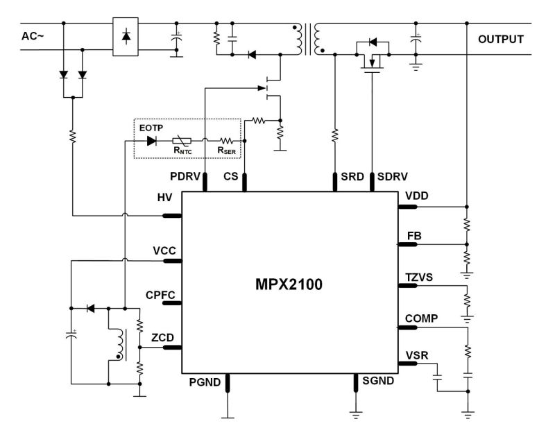 MPX2100 采用专有 SRZVS 控制技术来实现自适应零电压开关 (ZVS),可最大限度地降低开关损耗并省去专用的 ZVS 电路,因此可支持通用输入范围内的高频设计。