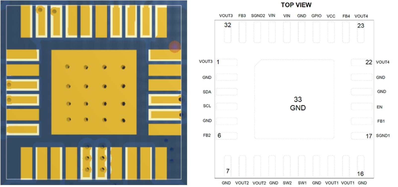 Figure 8 shows a PCB design example with a mixed pad design. This design is for the MPM54304, which has a LGA-33 (7mmx7mmx2mm) package. All of the power pads — including the large GND pad in the middle — utilize SMD design. Meanwhile, all the signal pads — including FB, SDA, and SCL— utilize NSMD design.
