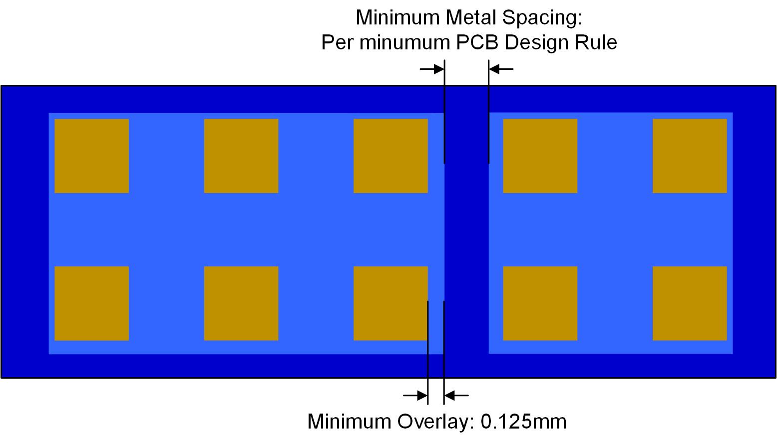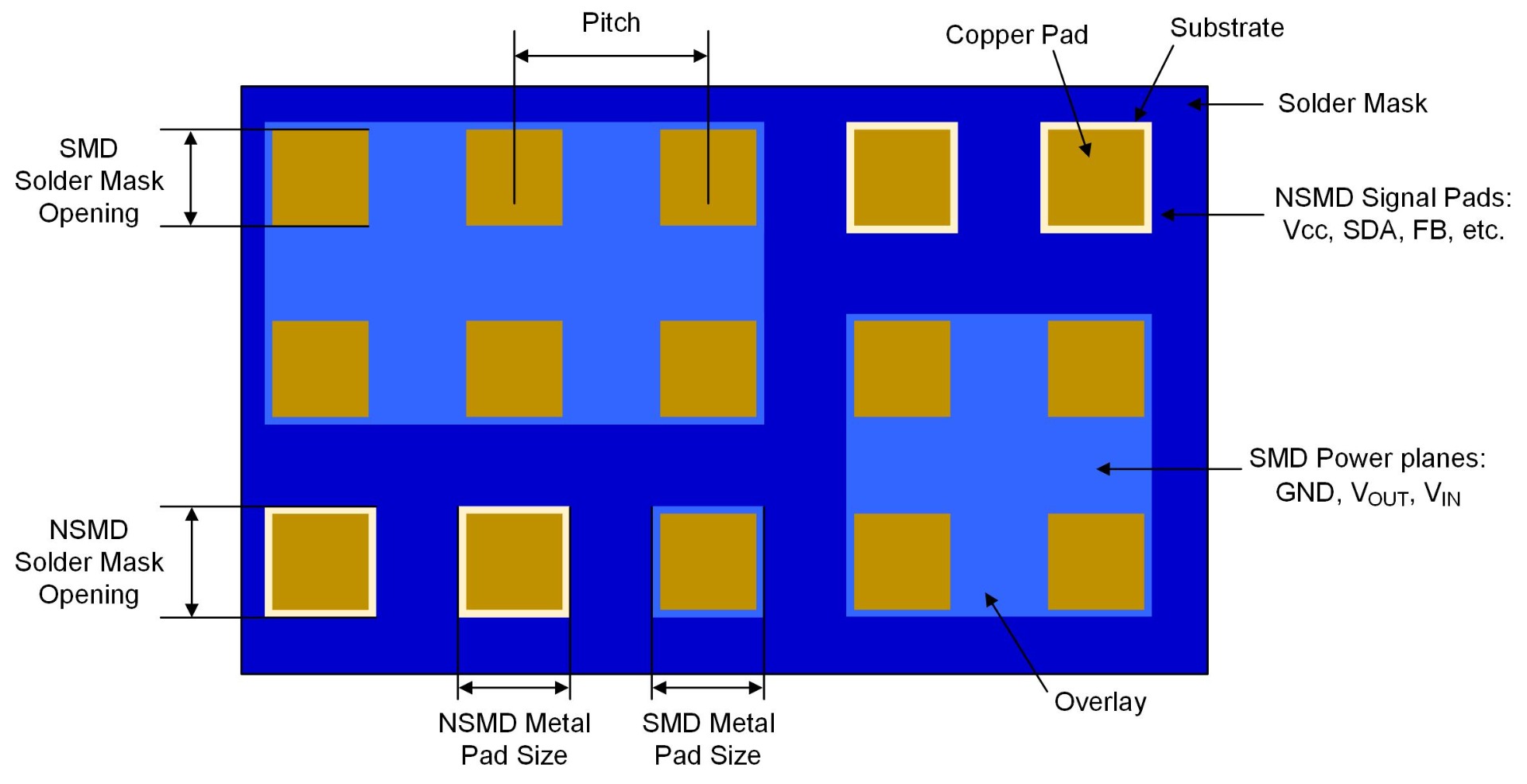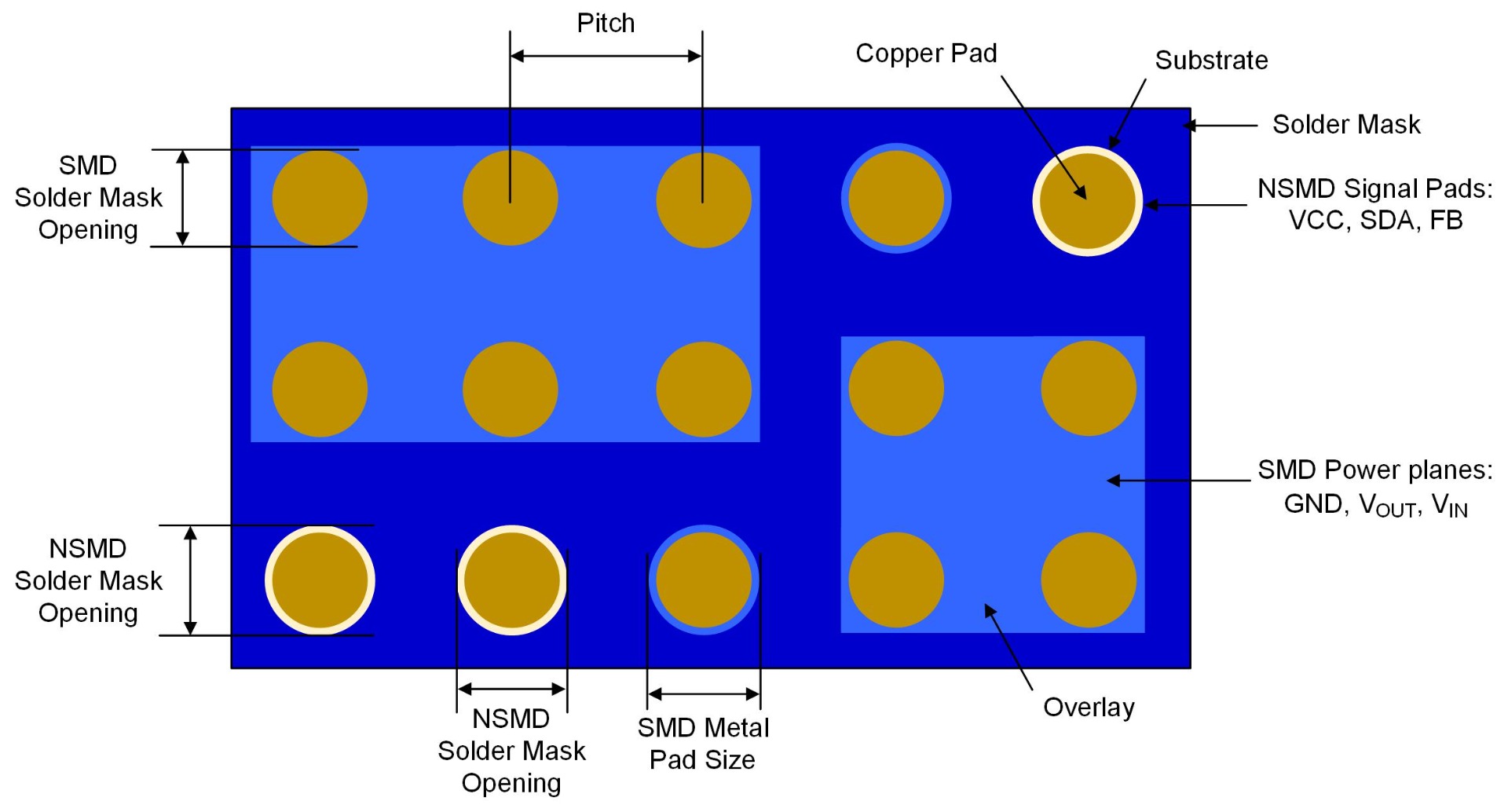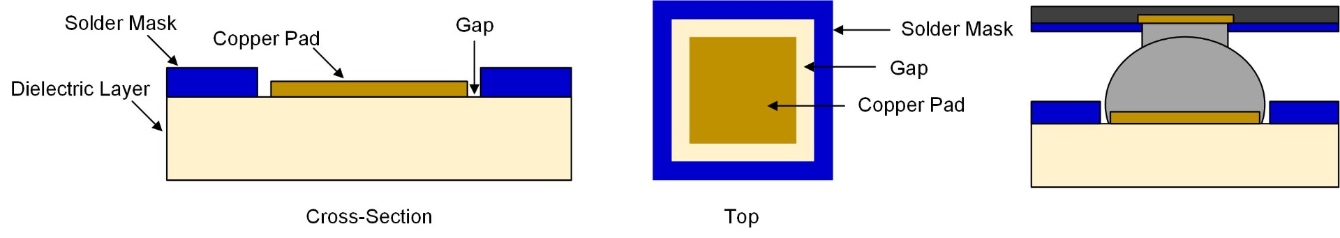 For a non-solder mask defined (NSMD) pad, the solder mask layer is designed with a gap between the solder mask and copper pad (see Figure 4). With this pad type, the copper pad area for solder paste printing is only defined by the dimension of copper pad itself, and not by the solder mask. Since NSMD pads have all the solder paste connected to the entire pad, NSMD pad designs feature better solder connections and solder joint reliability. However, the pad also tends to be easier to lift off from the PCB during assembly or under special operation conditions.
