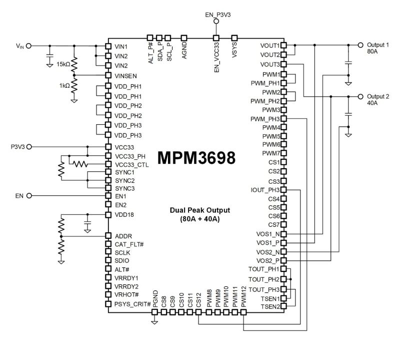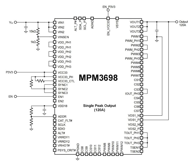 MPM3699 具有多种可简化系统设计的功能。该器件的每个相位都具有独立三态脉宽调制 (PWM) 输入,可与 MPM3698 配合使用。MPM3699 还支持独立精确电流采样和温度输出,用于报告每个相位的电感电流 (IL) 和结温 (TJ)。