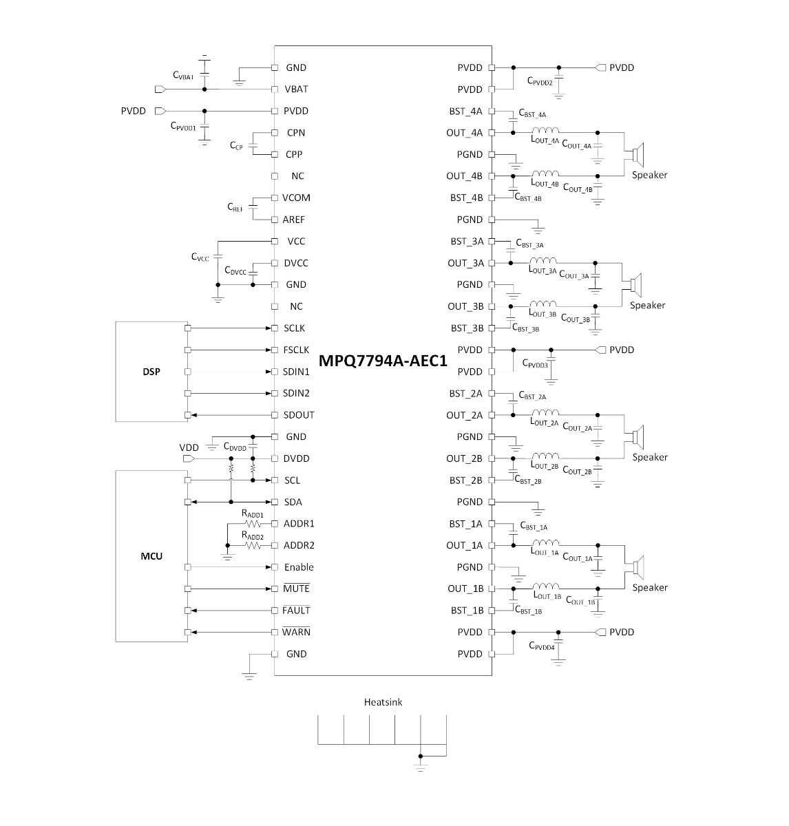 MPQ7795-AEC1 采用 BTL 结构,可通过 14.4V 电源为 4Ω 扬声器提供 24.5W 功率。MPS 的 D 类音频放大器均具有 AB 类放大器的高保真度和高效率。